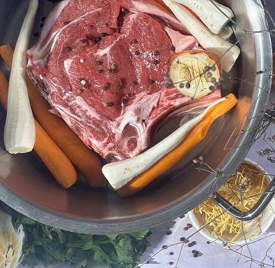 Izvadi meso i povrće, meso možeš iseckati na kockice i vratiti kasnije.